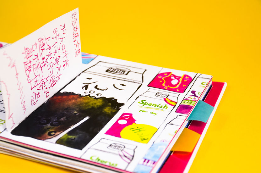 The book design is inspired by the spirit of pop art. By using daily objects as inspiration or visual elements to compose a story, a thought or feeling.