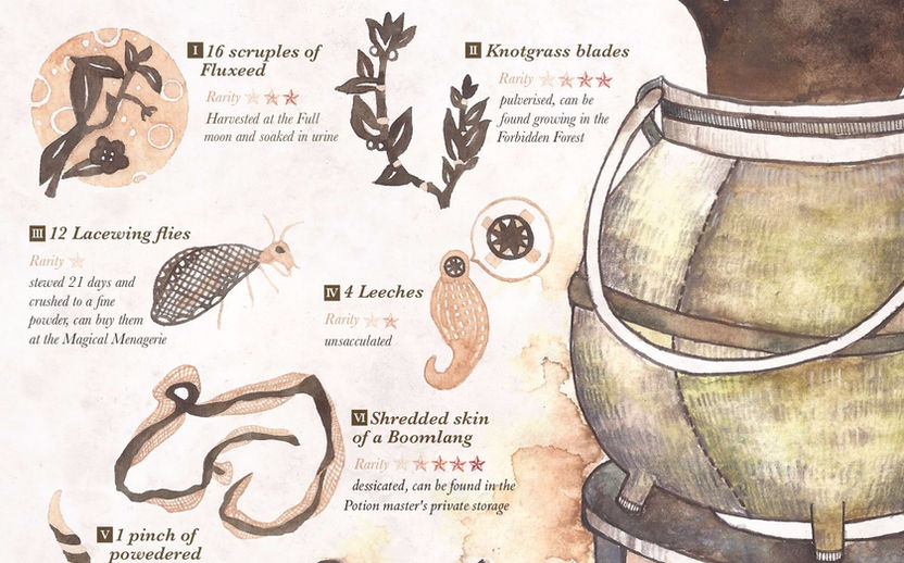 The infographic of 'A guide of polyujuice potion in Harry Potter' illustrates the unknown facts about the ingredients, creation and application, which are interesting information that is not detail shown in the movies.